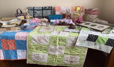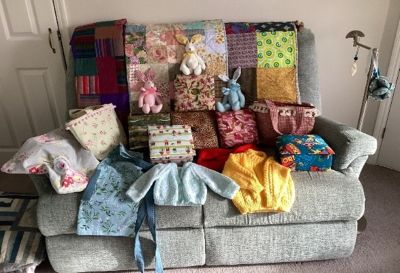 260 Easter eggs, 96 jumpers, 6 blankets, 66 hats, 9 packets of baby