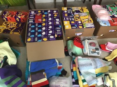 260 Easter eggs, 96 jumpers, 6 blankets, 66 hats, 9 packets of baby